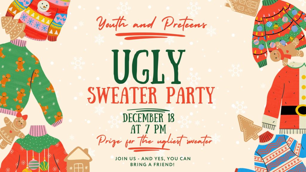 Youth and Preteens are invited to join us for our Ugly Sweater Party and celebrate Christmas and our last meeting of the year! Come join us at 7pm