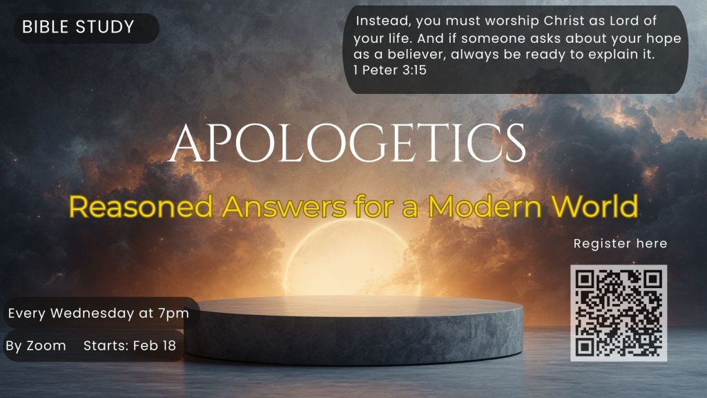 Are you ready to dive deep into the ‘why’ behind your faith? Our new Apologetics series kicks off on Wednesday, February 18th at 7:00 PM via Zoom. Join us as we explore the logical and historical foundations of the Christian faith. From the fine-tuning of the universe to the historical evidence for the Resurrection, this study provides reasoned answers to the most challenging questions of our time.