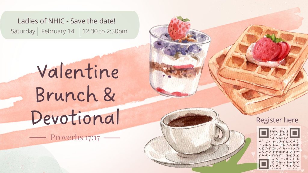 NHIC Ladies are invited to join us for a nice brunch on Feb 14 at 12:30 pm. Join us for a special time of fellowship, brunch and encouragement from God’s Word as we explore the theme of friendship in Christ.